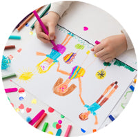 Lapsiperheiden pöydät ovat lähempänä leikkialuetta jossa rauhallista tekemistä.